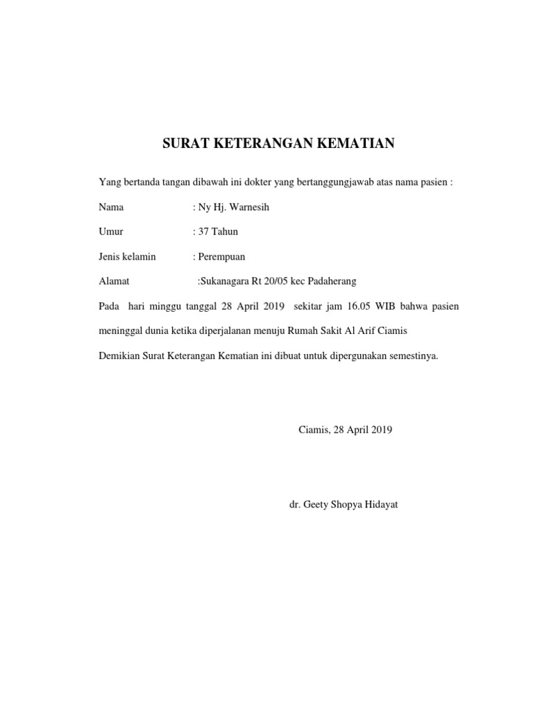 Contoh surat keterangan penelitian di atas harus menggunakan kop perusahaan atau lembaga dan dibubuhi stempel sebagai penanda bahwa surat tersebut resmi dan asli. Ketika anda bekerja dalam suatu perusahaan atau instansi, maka biasanya anda akan mendapatkan penghasilan setiap bulannya. Hal ini harus digaris bawahi dan dianggap penting, karena dokter harus bertanggungjawab sepenuhnya terhadap contoh formulir surat keterangan kematian dari rs. Demikian surat keterangan kematian ini kami buat sejujur jujurnya diberikan untuk dapat dipergunakan sebagaimana mestinya. Contoh surat keterangan aktif bekerja untuk npwp. Surat keterangan kematian merupakan suatu keterangan tentang kematian yang dibuat oleh dokter. Surat keterangan kematian dari kecamatan atau desa sebagai bukti atas meninggalnya saudara., dengan demikian pernyataan dari saudara yang membuat surat keterangan kematian ( sebagai ahli waris ) dapat di benarkan. Surat ini biasa menjadi salah satu syarat lampiran untuk mengajukan pencairan dana asuransi jiwa atau hal lainnya. Surat kematian dibuat untuk berbagai keperluan terkait, misalnya untuk membuat pengalihan harta warisan, asuransi. Atas perhatian bapak, kami ucapkan terima kasih. Dengan begitu laporan kita akan diproses dan akan dibuatkan surat kematian ini. Contoh surat keterangan kematian rumah sakit. Surat keterangan kematian pada umumnya diterbitkan oleh rumah sakit.
